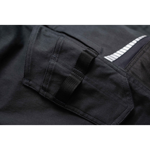 • men's working bip pants made of stretch fabric • elastic waistband with belt loops • 2 front pockets, 2 back pockets • 2 zipped thigh mesh ventilating pockets • 1 right side multifunctional pocket • 1 multifunctional chest pocket • reinforced knee parts for insertion of knee pads • reflective piping and printed details • legs extendable by 5 cm