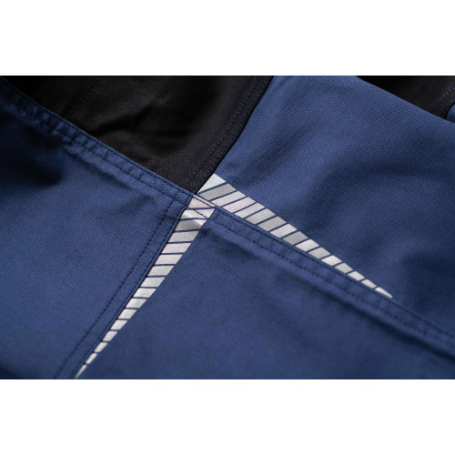 • men's working bip pants made of stretch fabric • elastic waistband with belt loops • 2 front pockets, 2 back pockets • 2 zipped thigh mesh ventilating pockets • 1 right side multifunctional pocket • 1 multifunctional chest pocket • reinforced knee parts for insertion of knee pads • reflective piping and printed details • legs extendable by 5 cm