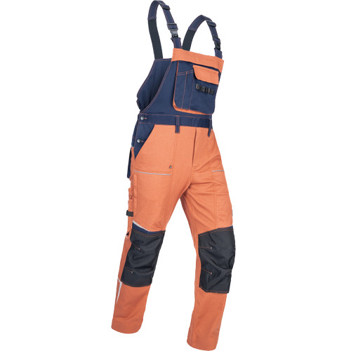 • men's working bip pants made of stretch fabric • elastic waistband with belt loops • 2 front pockets, 2 back pockets • 2 zipped thigh mesh ventilating pockets • 1 right side multifunctional pocket • 1 multifunctional chest pocket • reinforced knee parts for insertion of knee pads • reflective piping and printed details • legs extendable by 5 cm