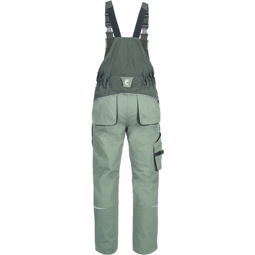 • men's working bip pants made of stretch fabric • elastic waistband with belt loops • 2 front pockets, 2 back pockets • 2 zipped thigh mesh ventilating pockets • 1 right side multifunctional pocket • 1 multifunctional chest pocket • reinforced knee parts for insertion of knee pads • reflective piping and printed details • legs extendable by 5 cm