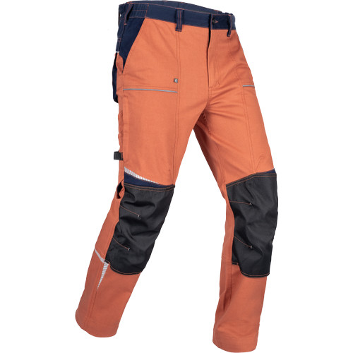• men's working pants made of stretch fabric • elastic waistband with belt loops • 2 front pockets, 2 back pockets • 2 zipped thigh mesh ventilating pockets • 1 right side multifunctional pocket • reinforced knee parts for insertion of knee pads • reflective piping and printed details • legs extendable by 5 cm