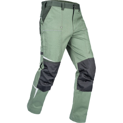 • men's working pants made of stretch fabric • elastic waistband with belt loops • 2 front pockets, 2 back pockets • 2 zipped thigh mesh ventilating pockets • 1 right side multifunctional pocket • reinforced knee parts for insertion of knee pads • reflective piping and printed details • legs extendable by 5 cm