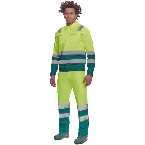 • férfi Hi-Vis kabát 5 cm széles fényvisszavető csíkokkal • tépőzáras hajtókával fedett cipzár • 2 nagy zsebfedős mellzseb • rugalmas oldalsó betétek az alsó szegélyen • tépőzáras mandzsetta