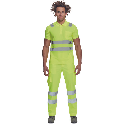 • férfi munkanadrág 7 cm széles fényvisszavető csíkokkal és HI-VIS elemekkel • 2 oldalsó zseb + 1 érmezseb • 2 oldalzseb • 2 hátsó zseb • rugalmas oldalsó betétek a derékon • meghosszabbítható szárhossz