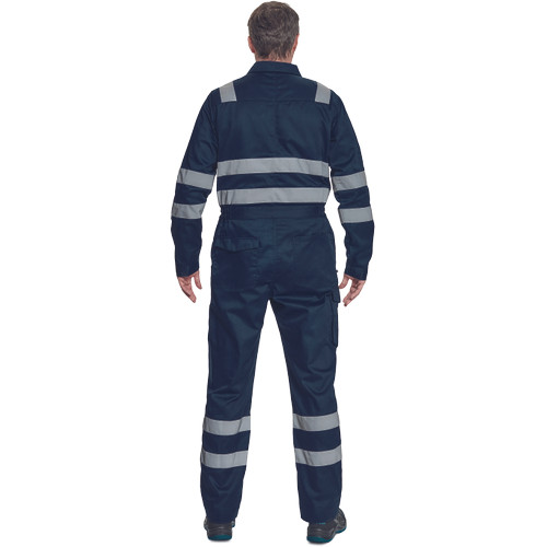 • férfi overall fényvisszavető csíkokkal • 5 cm széles csíkok a test körül • 7 cm széles csíkok a lábak körül • hajtókával fedett cipzár • 2 zseb az oldalán, 1 érmezseb • 1 multifunkciós oldalzseb a lábon • 2 hátsó zseb • 2 mellkasi zseb hajtókával • rugalmas betét a derék hátsó részén • meghosszabbítható szárhossz • 65% PES/35% pamut, 195 g/m2