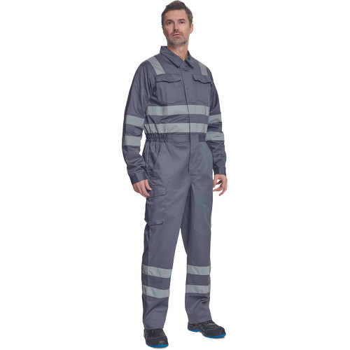 • férfi overall fényvisszavető csíkokkal • 5 cm széles csíkok a test körül • 7 cm széles csíkok a lábak körül • hajtókával fedett cipzár • 2 zseb az oldalán, 1 érmezseb • 1 multifunkciós oldalzseb a lábon • 2 hátsó zseb • 2 mellkasi zseb hajtókával • rugalmas betét a derék hátsó részén • meghosszabbítható szárhossz • 65% PES/35% pamut, 195 g/m2