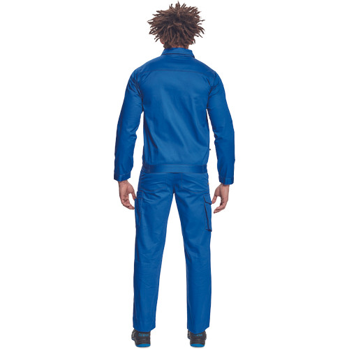 • férfi munkakabát • cipzáras, tépőzáras hajtókával • 2 nagy hajtókás mellkasi zseb • rugalmas oldalsó betétek a kabát alján • tépőzáras mandzsetta • 65% PES/35% pamut, 195 g/m2