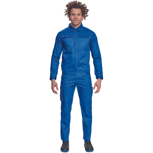 • férfi munkakabát • cipzáras, tépőzáras hajtókával • 2 nagy hajtókás mellkasi zseb • rugalmas oldalsó betétek a kabát alján • tépőzáras mandzsetta • 65% PES/35% pamut, 195 g/m2