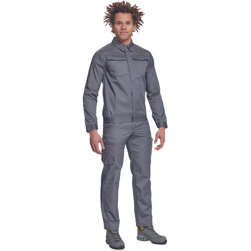 • férfi munkakabát • cipzáras, tépőzáras hajtókával • 2 nagy hajtókás mellkasi zseb • rugalmas oldalsó betétek a kabát alján • tépőzáras mandzsetta • 65% PES/35% pamut, 195 g/m2