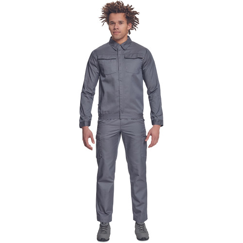 • férfi munkakabát • cipzáras, tépőzáras hajtókával • 2 nagy hajtókás mellkasi zseb • rugalmas oldalsó betétek a kabát alján • tépőzáras mandzsetta • 65% PES/35% pamut, 195 g/m2