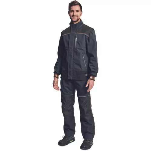 • férfi munkakabát állógallérral, modern mintázattal • 2 nagy oldalzseb, 1 multifunkcionális mellzseb • D-gyűrű, megerősítő rátét a vállakon Oxford 600D anyagból