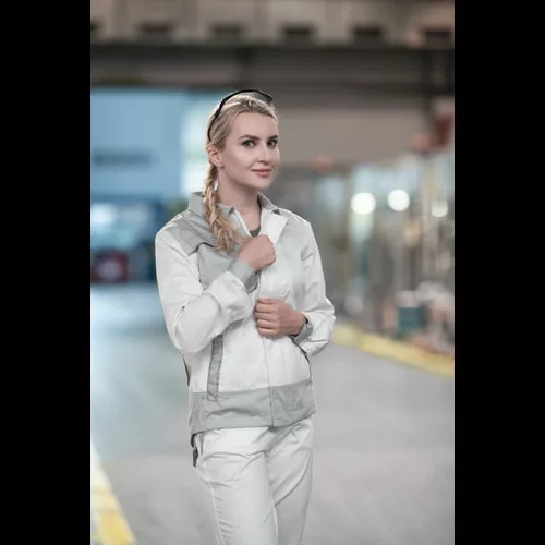 • női munkakabát pamut-PES kevertszálas anyagból • nőies szabás • dekoratív paszpol kontrasztos színekben • hálós betétek • fedett cipzár és zsebek • 2 oldalzseb • 1 mellzseb, benne rejtett D-gyűrűvel • ipari mosásra alkalmas • lehetőség az azonosító chip beillesztésére