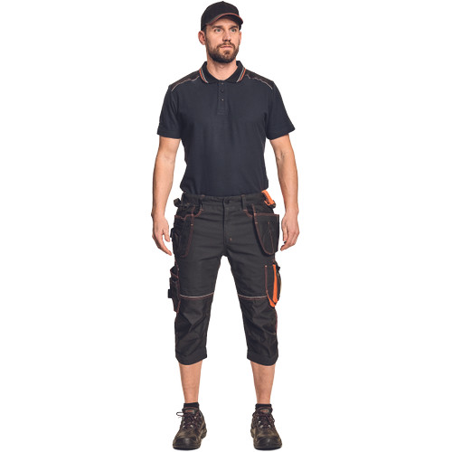 • férfi 3/4-es munkanadrág rugalmas derékkal • 2 oldalsó zseb, 2 repülőzseb, 2 szerszámtartó hurok • 2 oldalzseb a lábon, 1 átlátszó zseb igazolvány számára, D- gyűrű • 2 hátsó zseb • kalapácstartó kontrasztos színben • megerősített térdrész, térdvédőtartó • dekoratív, figyelemfelkeltő varrás színes cérnával
