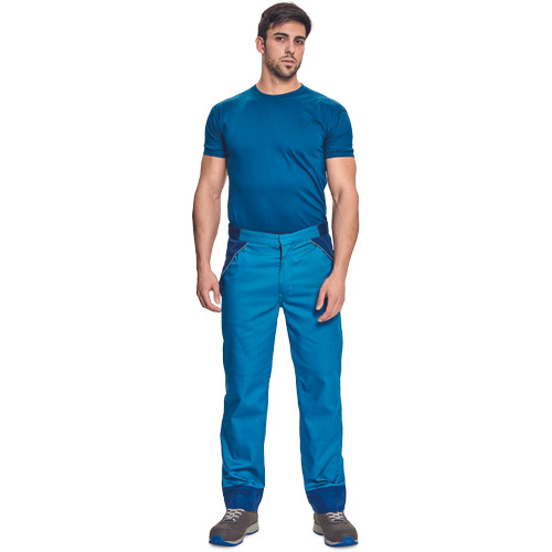 • férfi munkanadrág könnyű pamut-PES kevertszálas anyagból • dekoratív paszpol kontrasztos színekkel • hálós betétek • zsebfedős zsebek • a derékbőség tépőzárral állítható • 5 cm-rel leengedhető szárak • 2 első zseb, az egyikben D-gyűrű található • 1 hátsó zseb •tartós anyagú • puhább, hajlékonyabb szövet