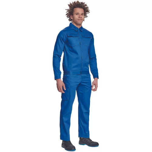 • férfi munkakabát • cipzáras, tépőzáras hajtókával • 2 nagy hajtókás mellkasi zseb • rugalmas oldalsó betétek a kabát alján • tépőzáras mandzsetta • 65% PES/35% pamut, 195 g/m2