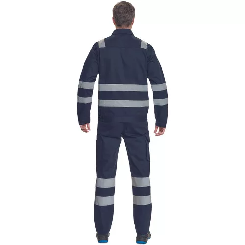 • férfi munkakabát 5 cm széles fényvisszavető csíkokkal • tépőzáras hajtókával fedett cipzár • 2 nagy zsebfedős mellzseb • rugalmas oldalsó betétek az alsó szegélyen • tépőzárral szűkíthető mandzsetták