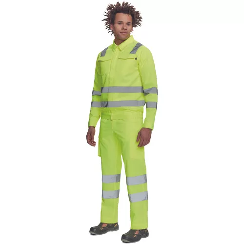 • férfi Hi-Vis kabát 5 cm széles fényvisszavető csíkokkal • cipzáras, tépőzáras hajtókával • 2 nagy hajtókás mellkasi zseb • rugalmas oldalsó betétek a kabát alján • tépőzáras mandzsetta