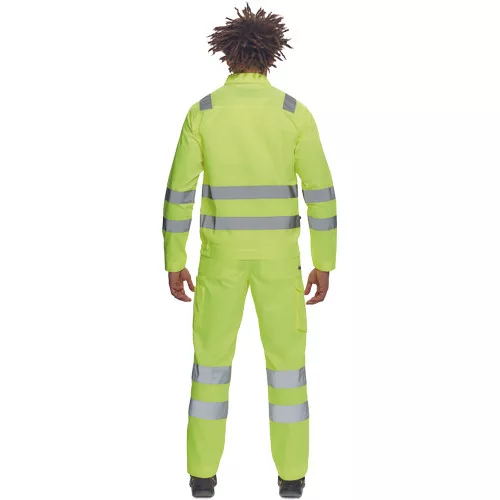 • férfi Hi-Vis kabát 5 cm széles fényvisszavető csíkokkal • cipzáras, tépőzáras hajtókával • 2 nagy hajtókás mellkasi zseb • rugalmas oldalsó betétek a kabát alján • tépőzáras mandzsetta
