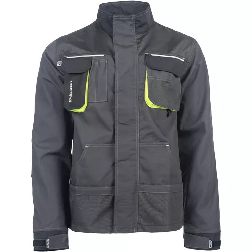 Férfi munkakabát. Cipzárral záródó kabát tépőzáras hajtókával, Oxford 600D megerősítő rátétekkel a váll-és könyökrészeken. 2-2 oldal - és mellzsebbel, 1 e-Secure anyagból készült telefontartó zsebbel. Fényvisszavető elemekkel, kontrasztos varrással.
