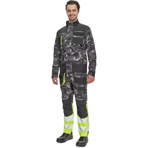 • férfi munkakabát • cipzárral záródó kabát tépőzáras hajtókával • Oxford 600D megerősítő rátétekkel a váll-és könyökrészeken • 2-2 oldal - és mellzsebbel, 1 e-Secure anyagból készült telefontartó zsebbel • fényvisszavető elemek, kontrasztos tűzés • modern terepminta