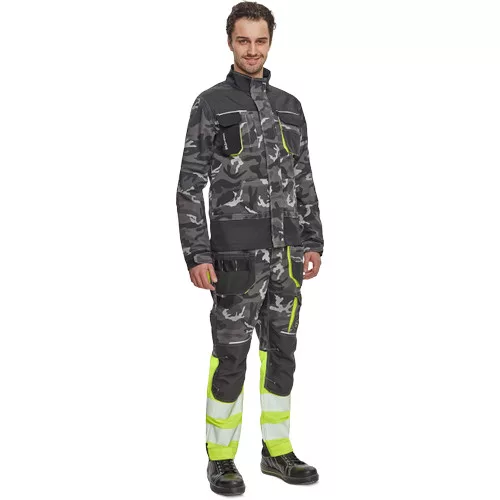 • férfi munkakabát • cipzárral záródó kabát tépőzáras hajtókával • Oxford 600D megerősítő rátétekkel a váll-és könyökrészeken • 2-2 oldal - és mellzsebbel, 1 e-Secure anyagból készült telefontartó zsebbel • fényvisszavető elemek, kontrasztos tűzés • modern terepminta