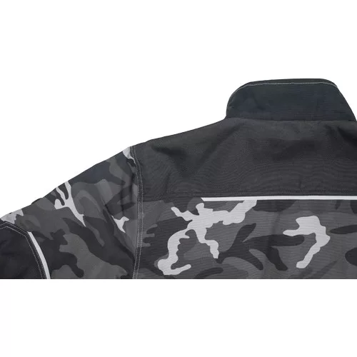 • férfi munkakabát • cipzárral záródó kabát tépőzáras hajtókával • Oxford 600D megerősítő rátétekkel a váll-és könyökrészeken • 2-2 oldal - és mellzsebbel, 1 e-Secure anyagból készült telefontartó zsebbel • fényvisszavető elemek, kontrasztos tűzés • modern terepminta