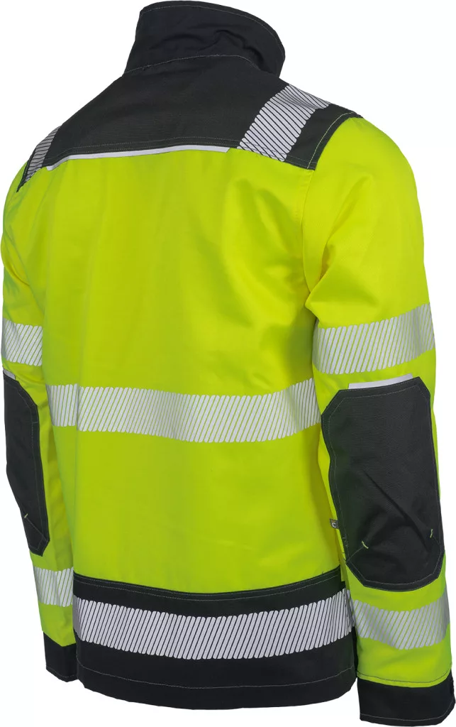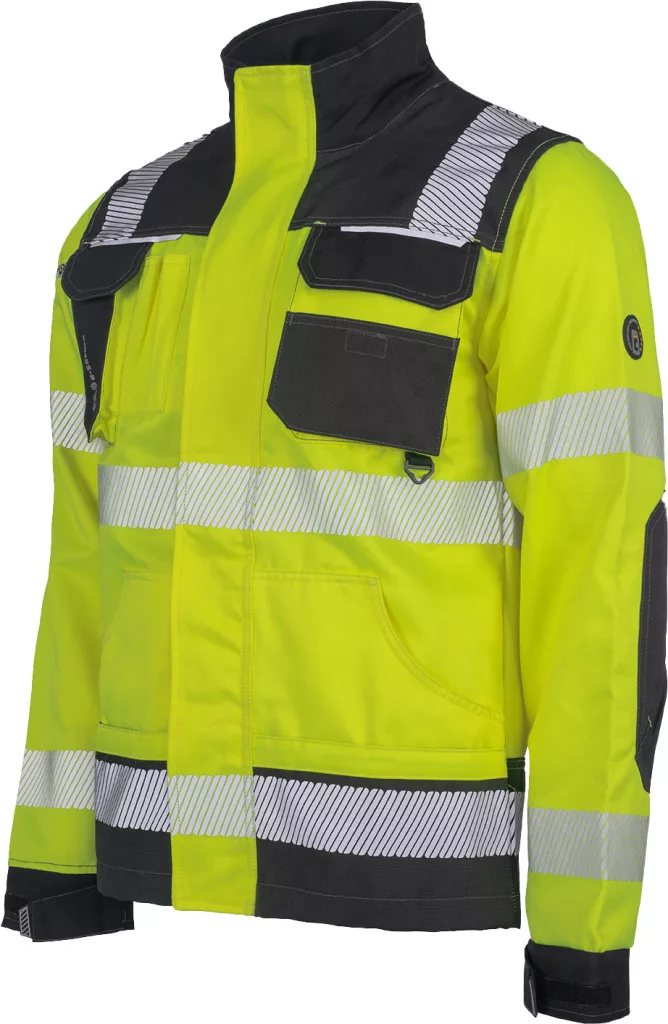 • férfi jólláthatósági munkakabát • cipzárral záródó kialakítás tépőzáras hajtókával, Oxford 600D megerősítő rátétekkel a váll-és könyökrészeken • 2-2 oldal - és mellzsebbel, 1 e-Secure anyagból készült telefontartó zsebbel • fényvisszavető részletekkel • 5 cm -es fényvisszavető csíkokkal a derékrészen, az ujjakon és a vállakon