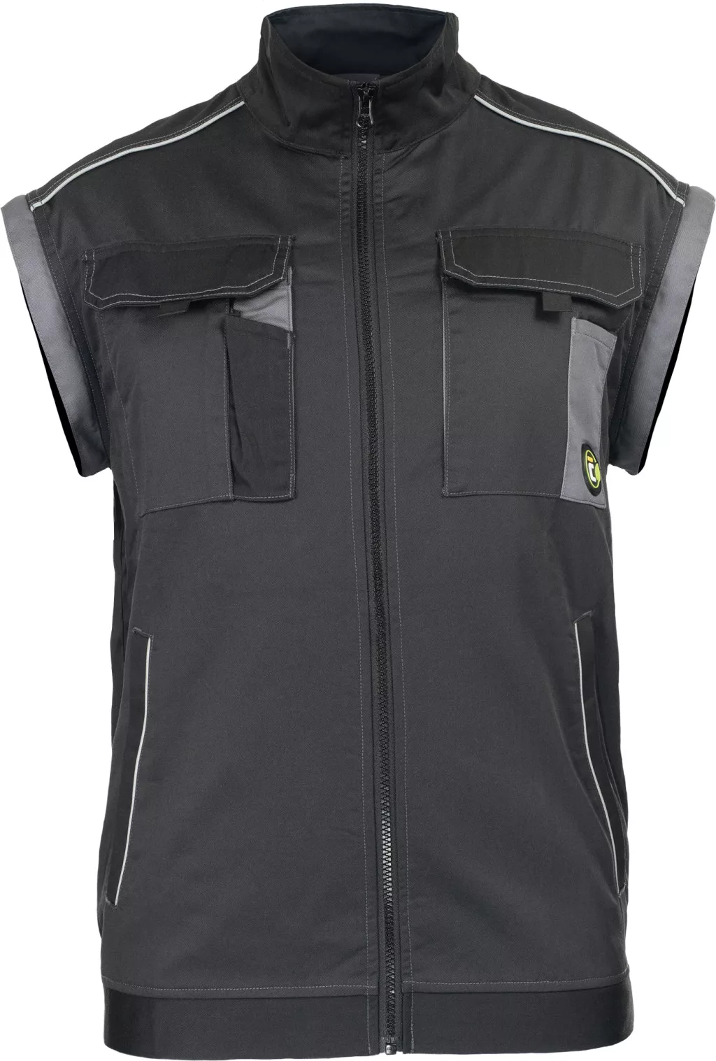 • férfi munkakabát cipzárral, takart patentes borítással • 2 oldalzseb • 2 tépőzáras mellzseb • megerősített vállrészek • levehető ujjak rugalmas mandzsettákkal • rugalmas derékpánt • fényvisszavető részletek