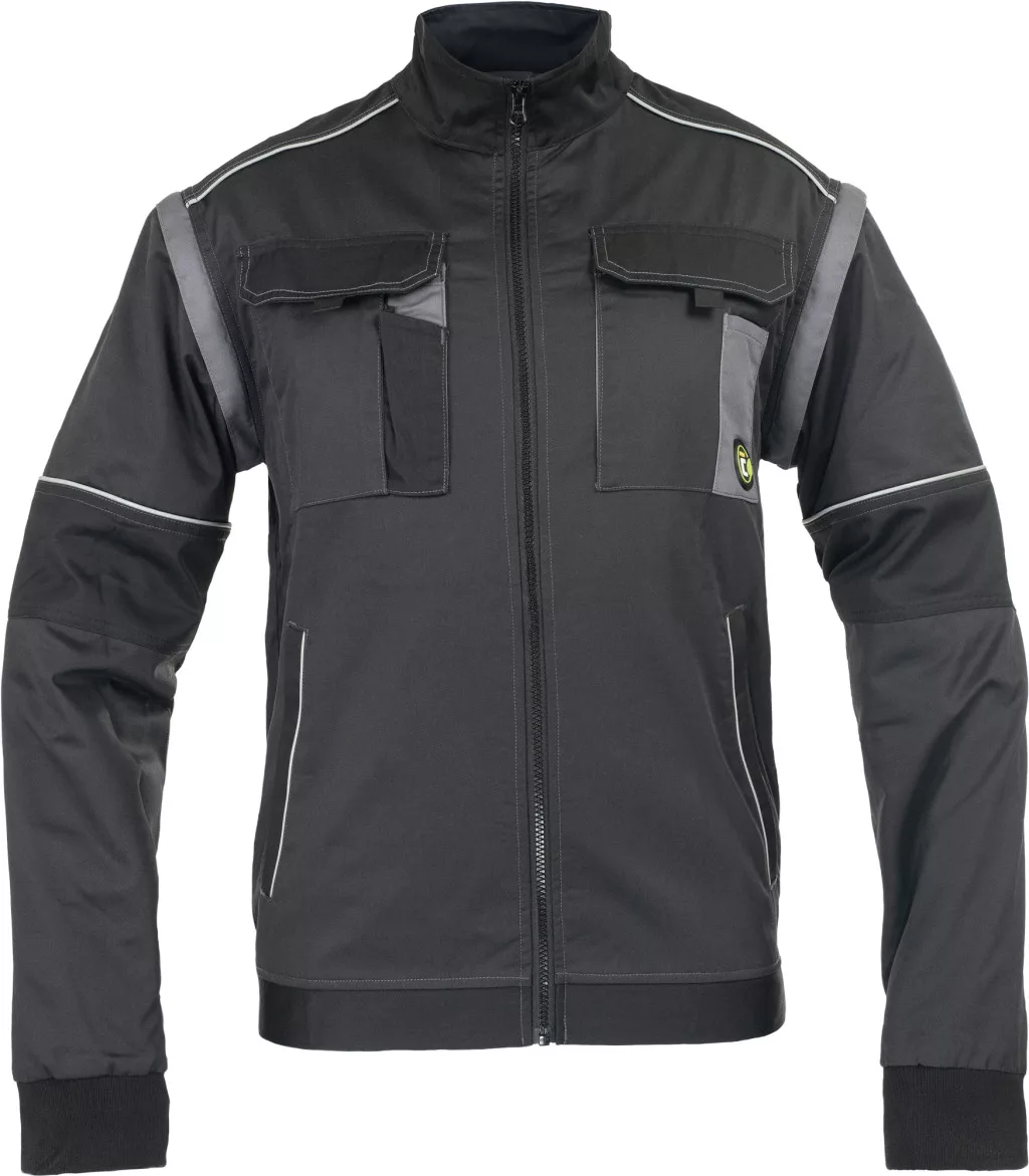 • férfi munkakabát cipzárral, takart patentes borítással • 2 oldalzseb • 2 tépőzáras mellzseb • megerősített vállrészek • levehető ujjak rugalmas mandzsettákkal • rugalmas derékpánt • fényvisszavető részletek