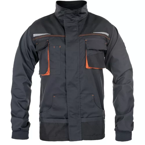 • férfi munkakabát, rendkívül tartós rugalmas anyagból • elöl cipzárral, védőfedéllel • 2 oldalzseb • 2 mellzseb, az egyik mobiltartó zsebbel • Oxford 600D megerősített váll- és könyökrészek • fényvisszavető elemek • kötött, elasztikus ujj mandzsetta