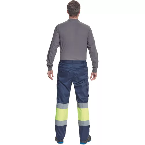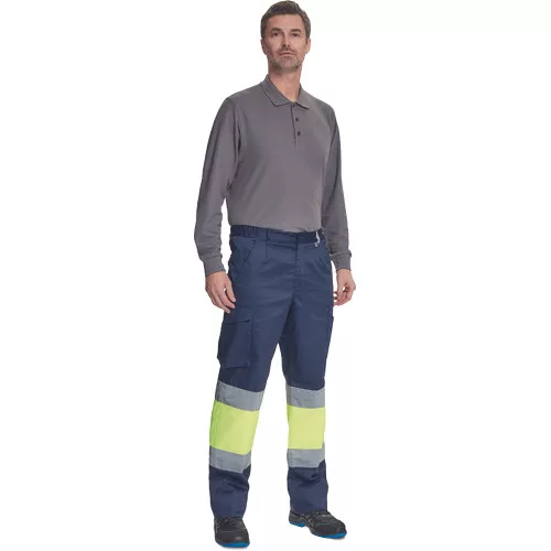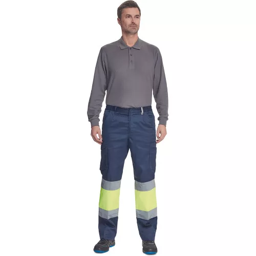 • férfi munkanadrág 7 cm széles fényvisszavető csíkokkal és Hi-Vis elemekkel • 2 első zseb + 1 érmezseb • 2 oldalzseb • 2 hátsó zseb • rugalmas oldalsó betétek a derékpánton • leengedhető szárak